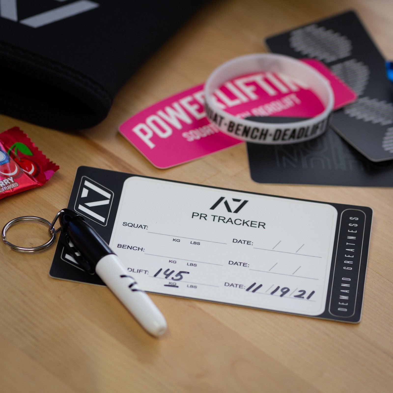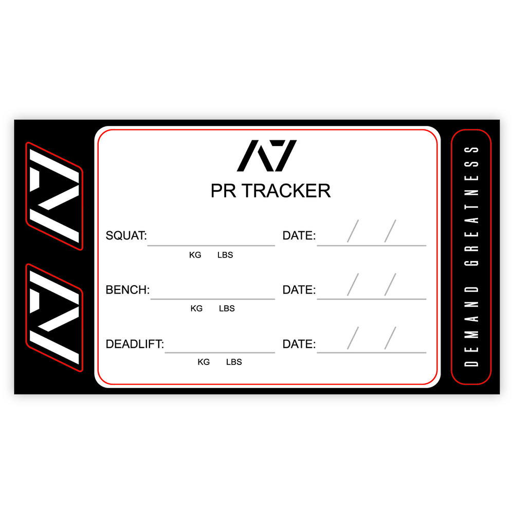 A7 PR Tracker sheet was designed to allow you to document your PRs and progress in your training of Squat, Bench and Deadlift in a convenient sheet that you can attach to your belt, your gym banner or even your home gym wall. It includes a small A7 Permanent marker with a keyring to help document your success along with 2 A7 stickers and 1 Demand Greatness sticker.