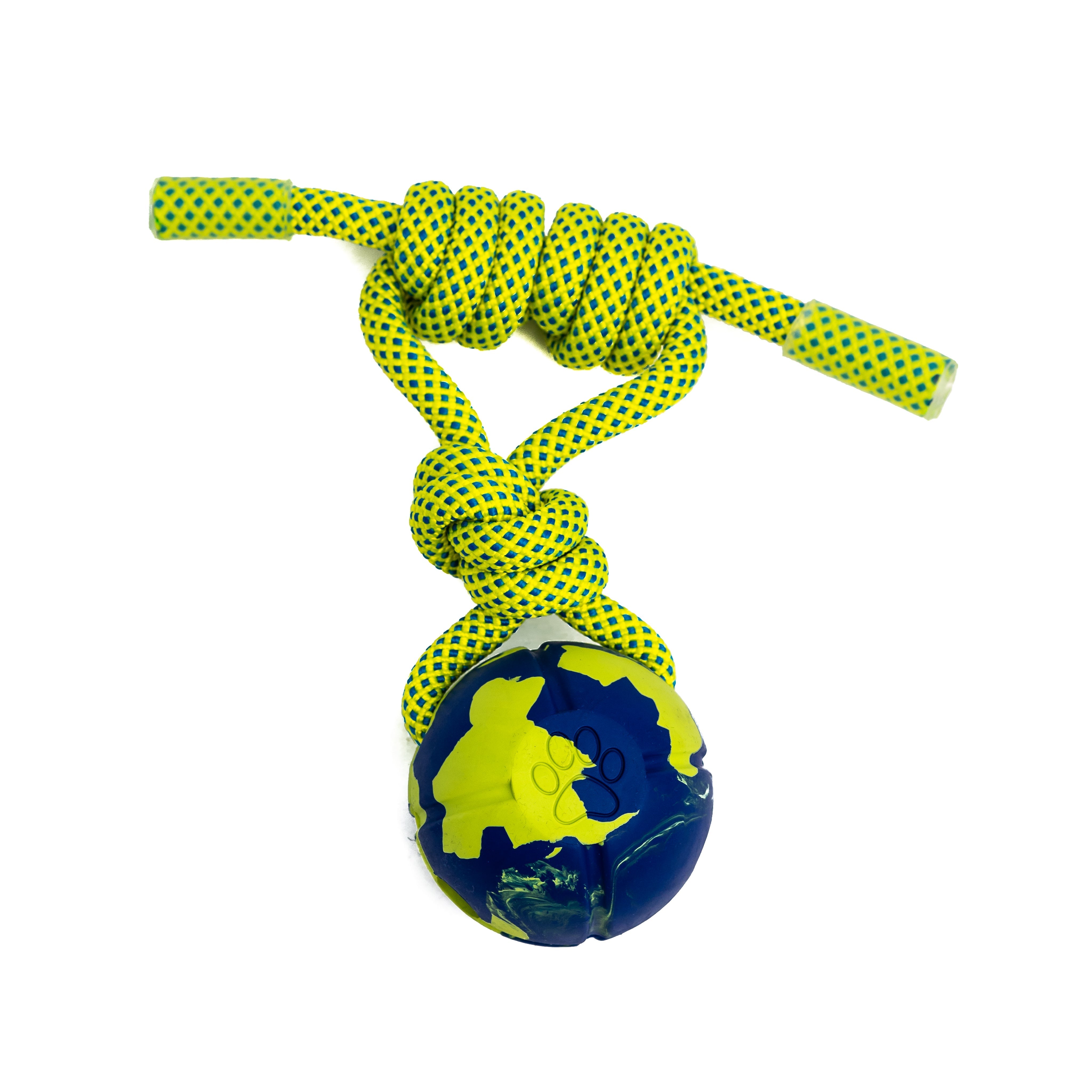 The ball is made from natural rubber, which is non-toxic and very durable. Natural rubber is a raw material produced from latex, an organic substance extracted from the sap of various species of trees. The string is made from durable nylon rope with end coverings.