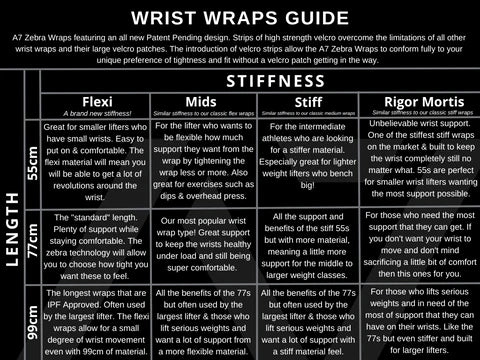 We offer Zebra wrist wraps in 3 lengths (55 cm [21 in], 77 cm [30 in], and 99 cm [39 in]) and 4 stiffnesses (Flexi, Mids, Stiff, and Rigor Mortis).